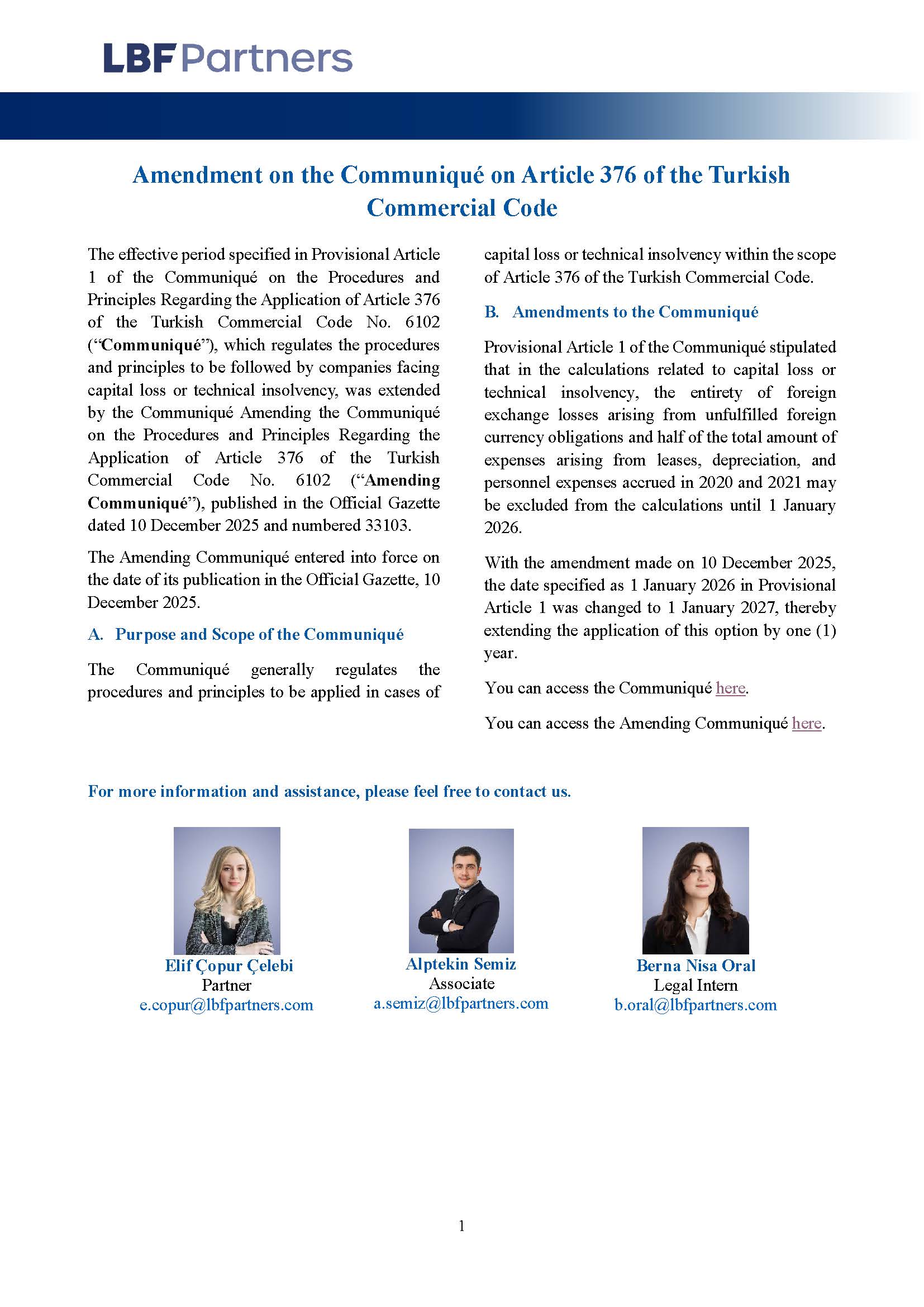 The effective period specified in Provisional Article 1 of the Communiqué on the Procedures and Principles Regarding the Application of Article 376 of the Turkish Commercial Code No. 6102 (“Communiqué”), which regulates the procedures and principles to be followed by companies facing capital loss or technical insolvency, was extended by the Communiqué Amending the Communiqué on the Procedures and Principles Regarding the Application of Article 376 of the Turkish Commercial Code No. 6102 (“Amending Communiqué”), published in the Official Gazette dated 10 December 2025 and numbered 33103.