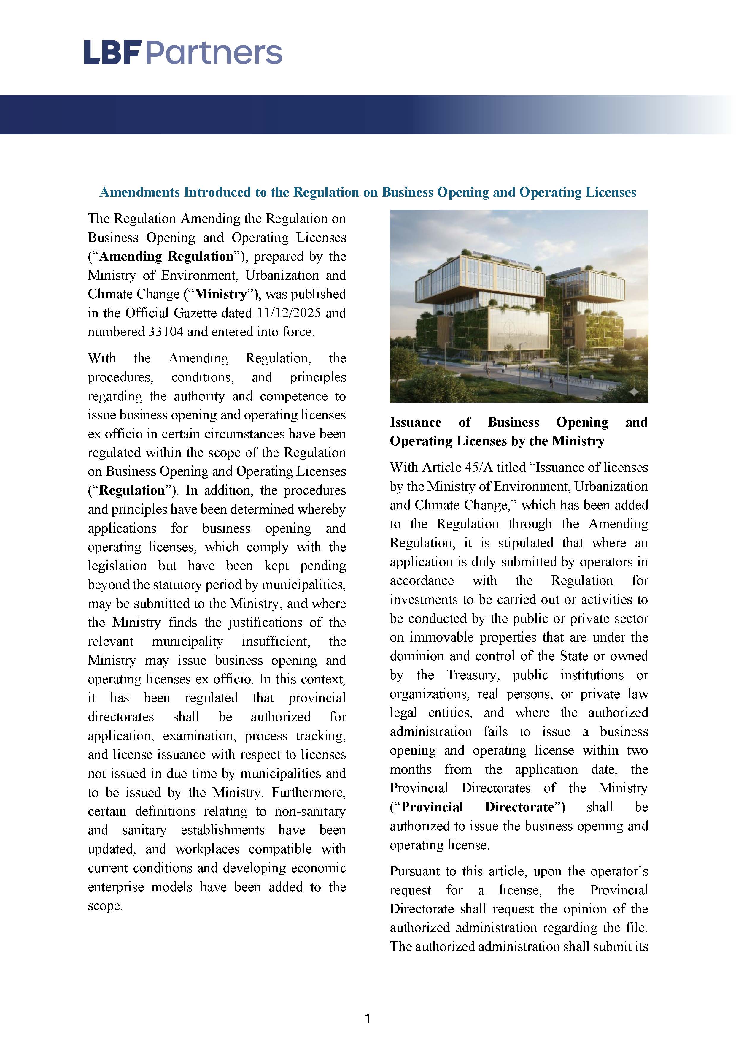 The Regulation Amending the Regulation on Business Opening and Operating Licenses (“Amending Regulation”), prepared by the Ministry of Environment, Urbanization and Climate Change (“Ministry”), was published in the Official Gazette dated 11/12/2025 and numbered 33104 and entered into force.