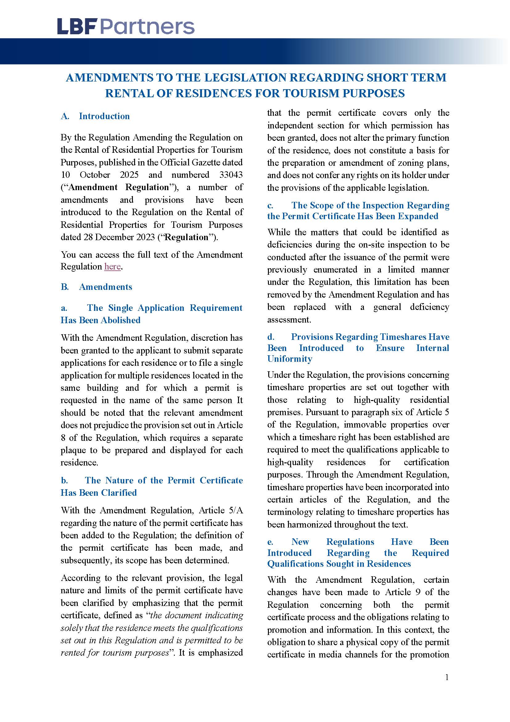 By the Regulation Amending the Regulation on the Rental of Residential Properties for Tourism Purposes, published in the Official Gazette dated 10 October 2025 and numbered 33043 (“Amendment Regulation”), a number of amendments and provisions have been introduced to the Regulation on the Rental of Residential Properties for Tourism Purposes dated 28 December 2023 (“Regulation”).