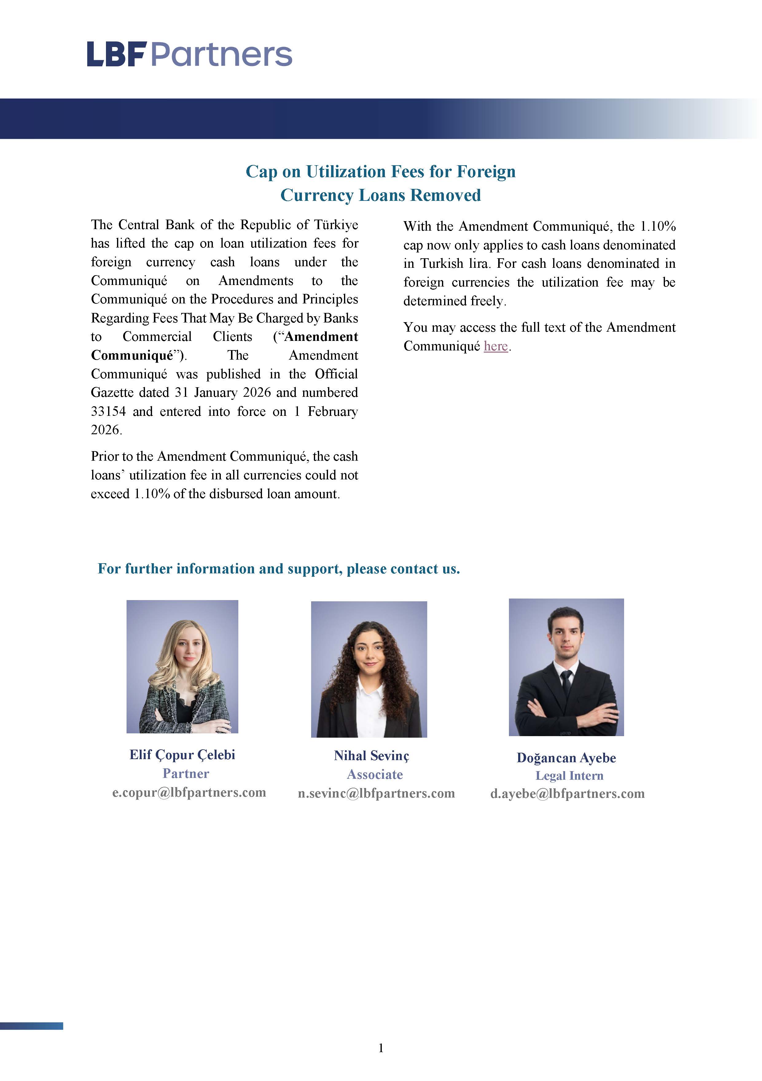 The Central Bank of the Republic of Türkiye has lifted the cap on loan utilization fees for foreign currency cash loans under the Communiqué on Amendments to the Communiqué on the Procedures and Principles Regarding Fees That May Be Charged by Banks to Commercial Clients (“Amendment Communiqué”). The Amendment Communiqué was published in the Official Gazette dated 31 January 2026 and numbered 33154 and entered into force on 1 February 2026.