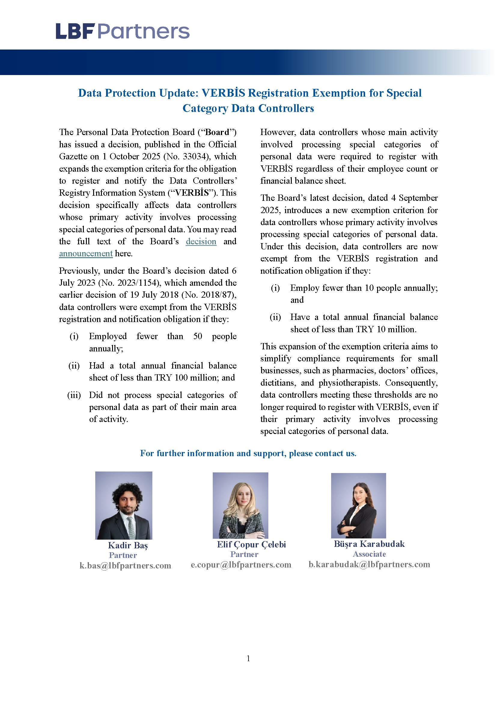 The Personal Data Protection Board (“Board”) has issued a decision, published in the Official Gazette on 1 October 2025 (No. 33034), which expands the exemption criteria for the obligation to register and notify the Data Controllers’ Registry Information System (“VERBİS”). This decision specifically affects data controllers whose primary activity involves processing special categories of personal data. You may read the full text of the Board’s decision and announcement here.