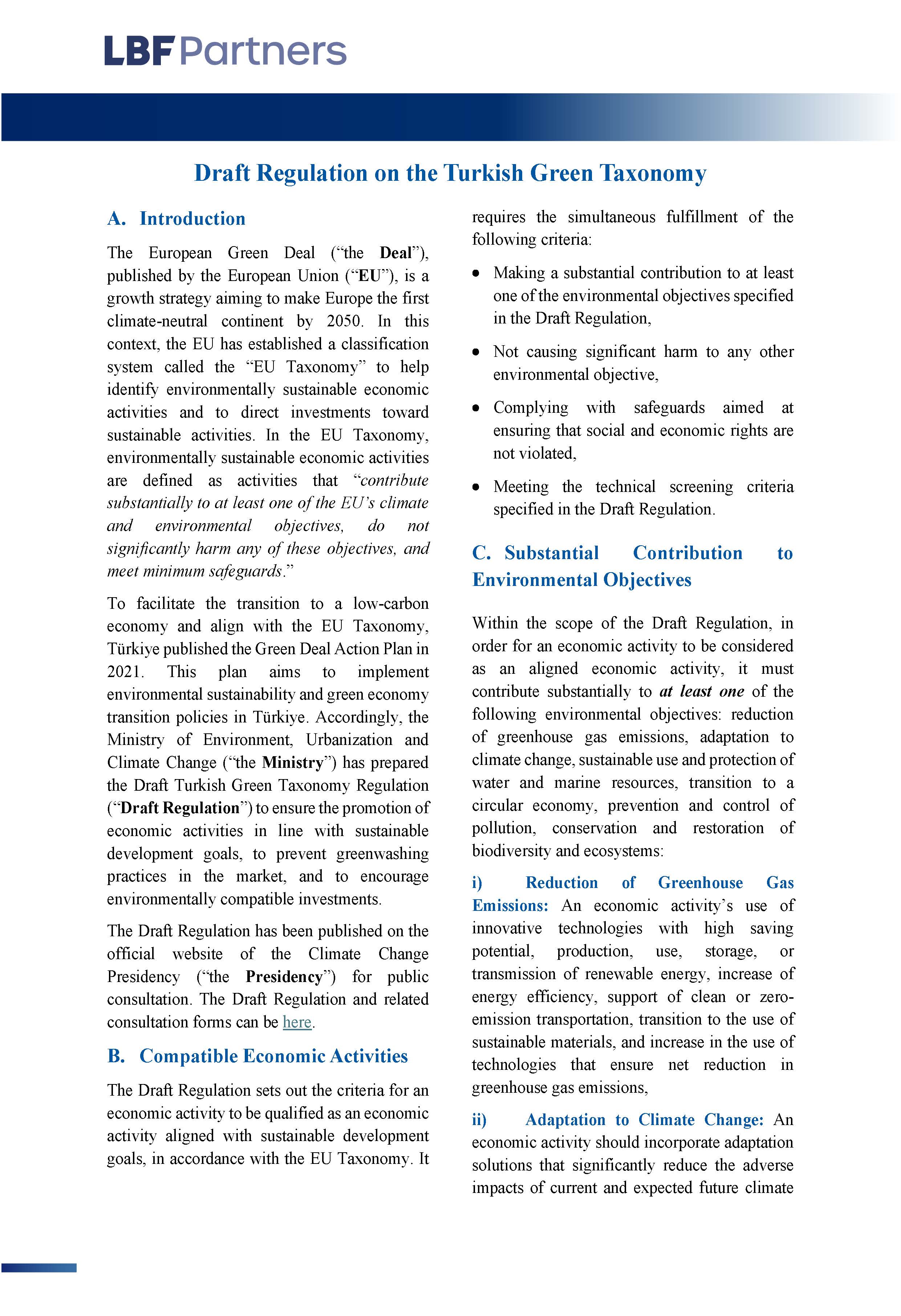 To facilitate the transition to a low-carbon economy and align with the EU Taxonomy, Türkiye published the Green Deal Action Plan in 2021. This plan aims to implement environmental sustainability and green economy transition policies in Türkiye. Accordingly, the Ministry of Environment, Urbanization and Climate Change (“the Ministry”) has prepared the Draft Turkish Green Taxonomy Regulation (“Draft Regulation”) to ensure the promotion of economic activities in line with sustainable development goals, to prevent greenwashing practices in the market, and to encourage environmentally compatible investments.