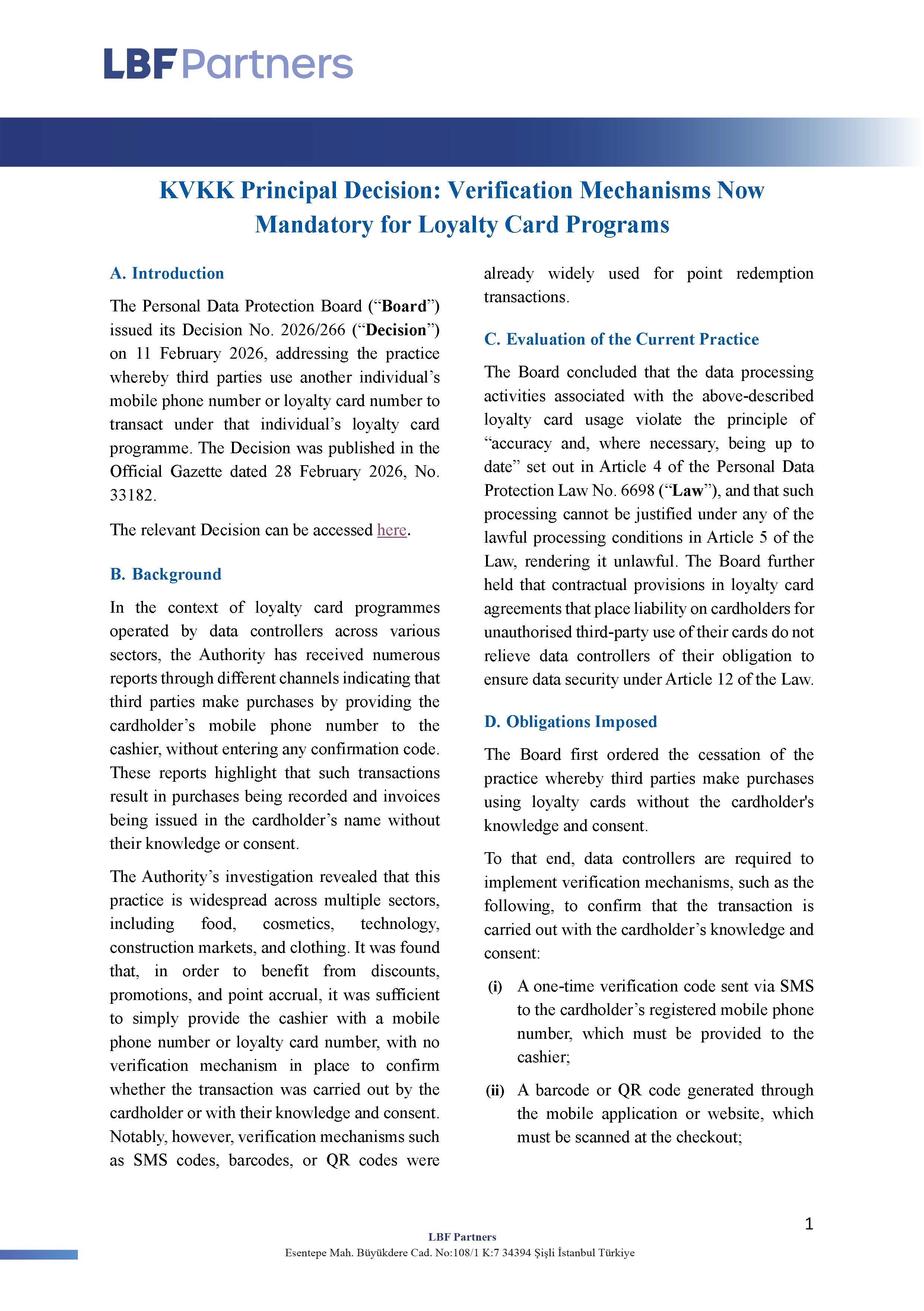 The Personal Data Protection Board (“Board”) issued its Decision No. 2026/266 (“Decision”) on 11 February 2026, addressing the practice whereby third parties use another individual’s mobile phone number or loyalty card number to transact under that individual’s loyalty card programme. The Decision was published in the Official Gazette dated 28 February 2026, No. 33182.