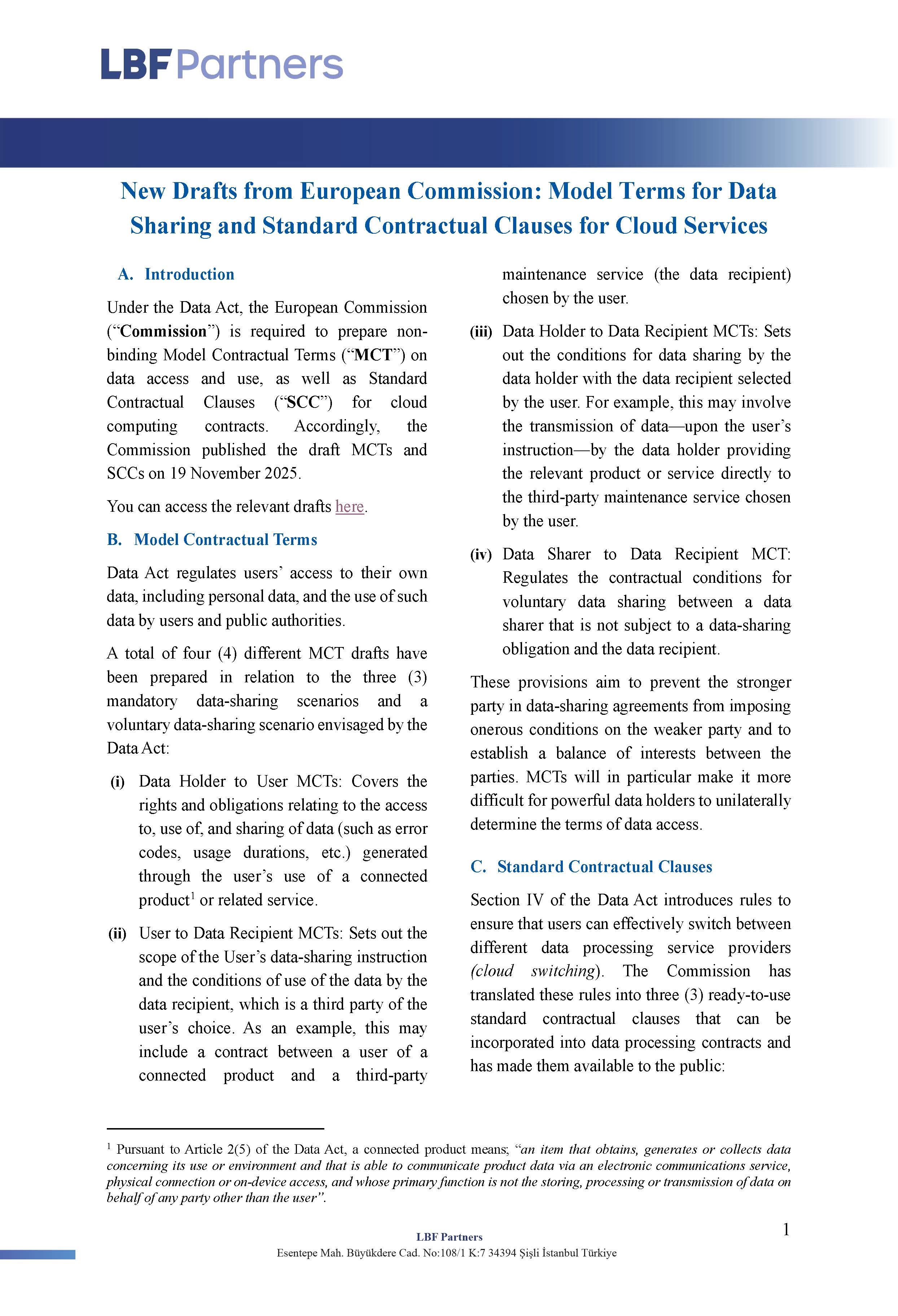 Under the Data Act, the European Commission (“Commission”) is required to prepare non-binding Model Contractual Terms (“MCT”) on data access and use, as well as Standard Contractual Clauses (“SCC”) for cloud computing contracts. Accordingly, the Commission published the draft MCTs and SCCs on 19 November 2025.