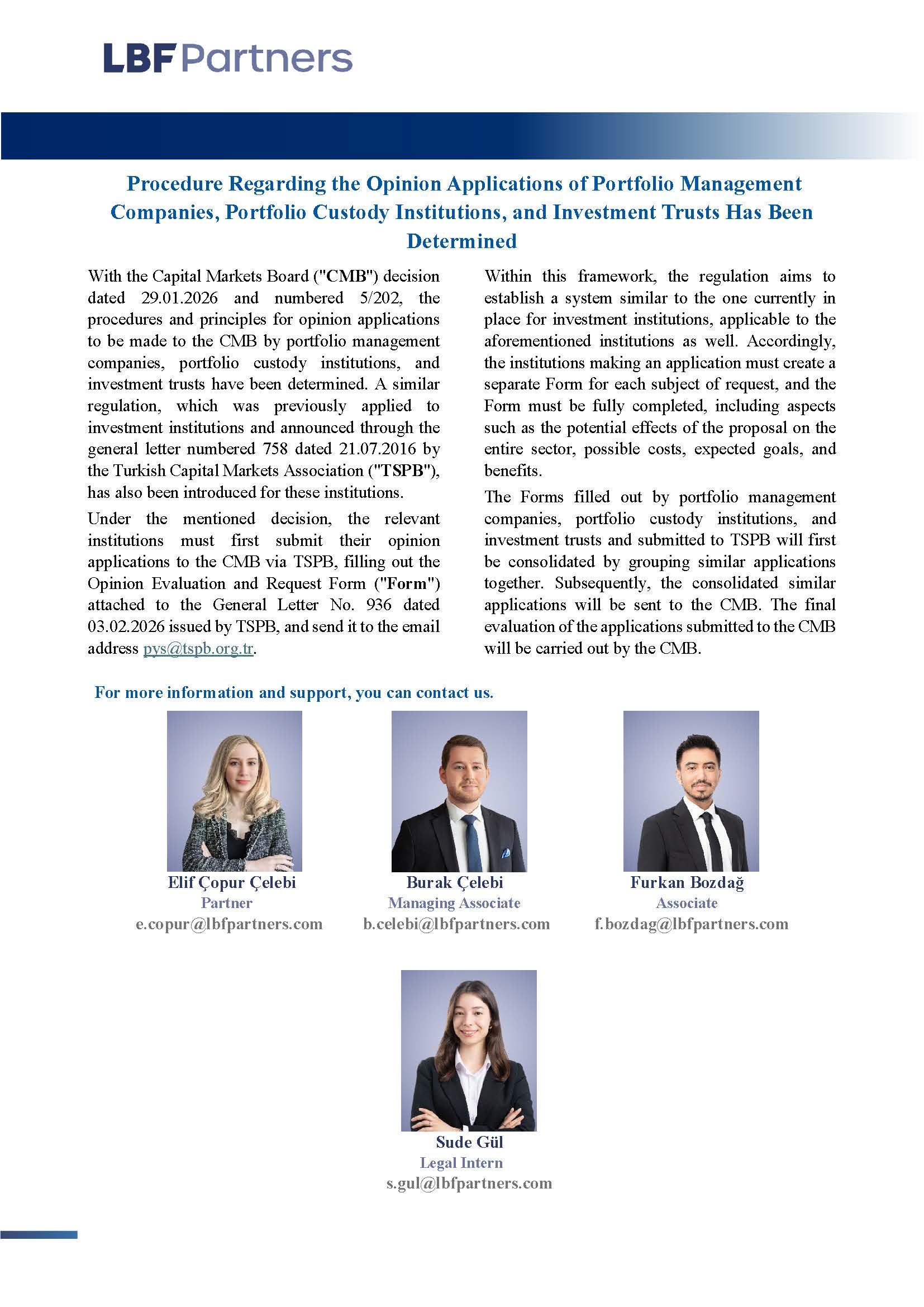 With the Capital Markets Board ("CMB") decision dated 29.01.2026 and numbered 5/202, the procedures and principles for opinion applications to be made to the CMB by portfolio management companies, portfolio custody institutions, and investment trusts have been determined. A similar regulation, which was previously applied to investment institutions and announced through the general letter numbered 758 dated 21.07.2016 by the Turkish Capital Markets Association ("TSPB"), has also been introduced for these institutions.