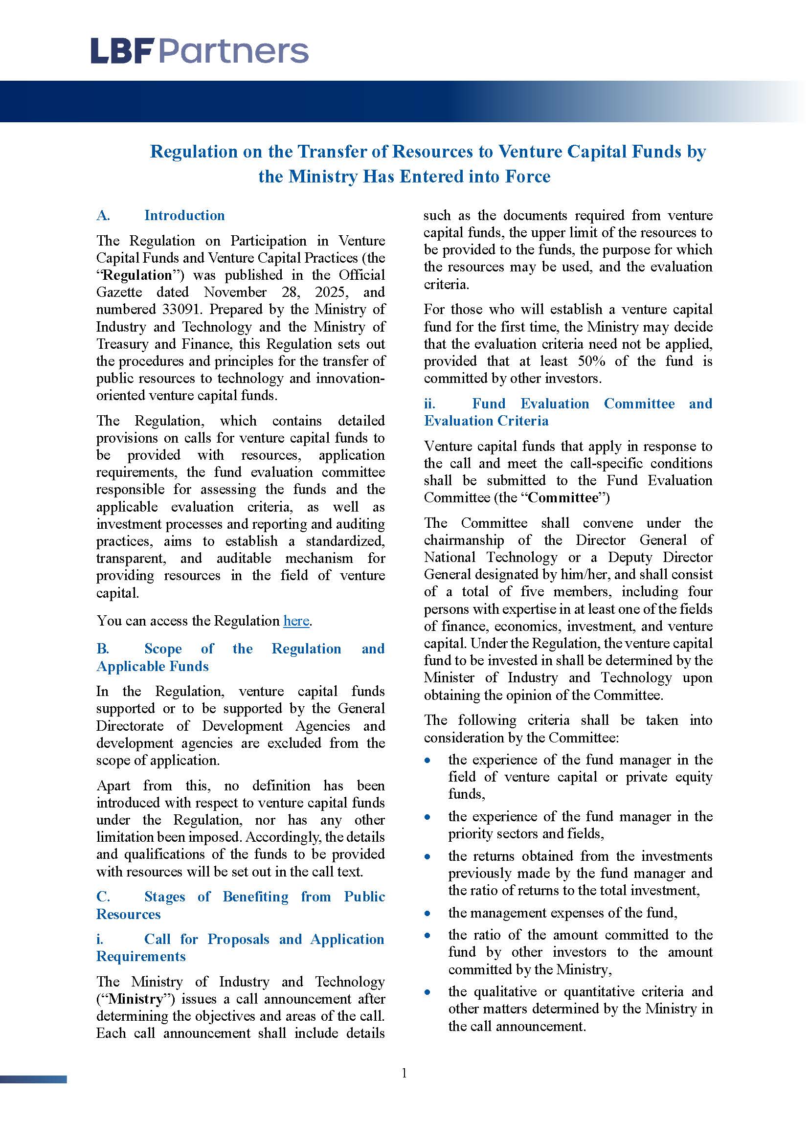 The Regulation on Participation in Venture Capital Funds and Venture Capital Practices (the “Regulation”) was published in the Official Gazette dated November 28, 2025, and numbered 33091. Prepared by the Ministry of Industry and Technology and the Ministry of Treasury and Finance, this Regulation sets out the procedures and principles for the transfer of public resources to technology and innovation-oriented venture capital funds.