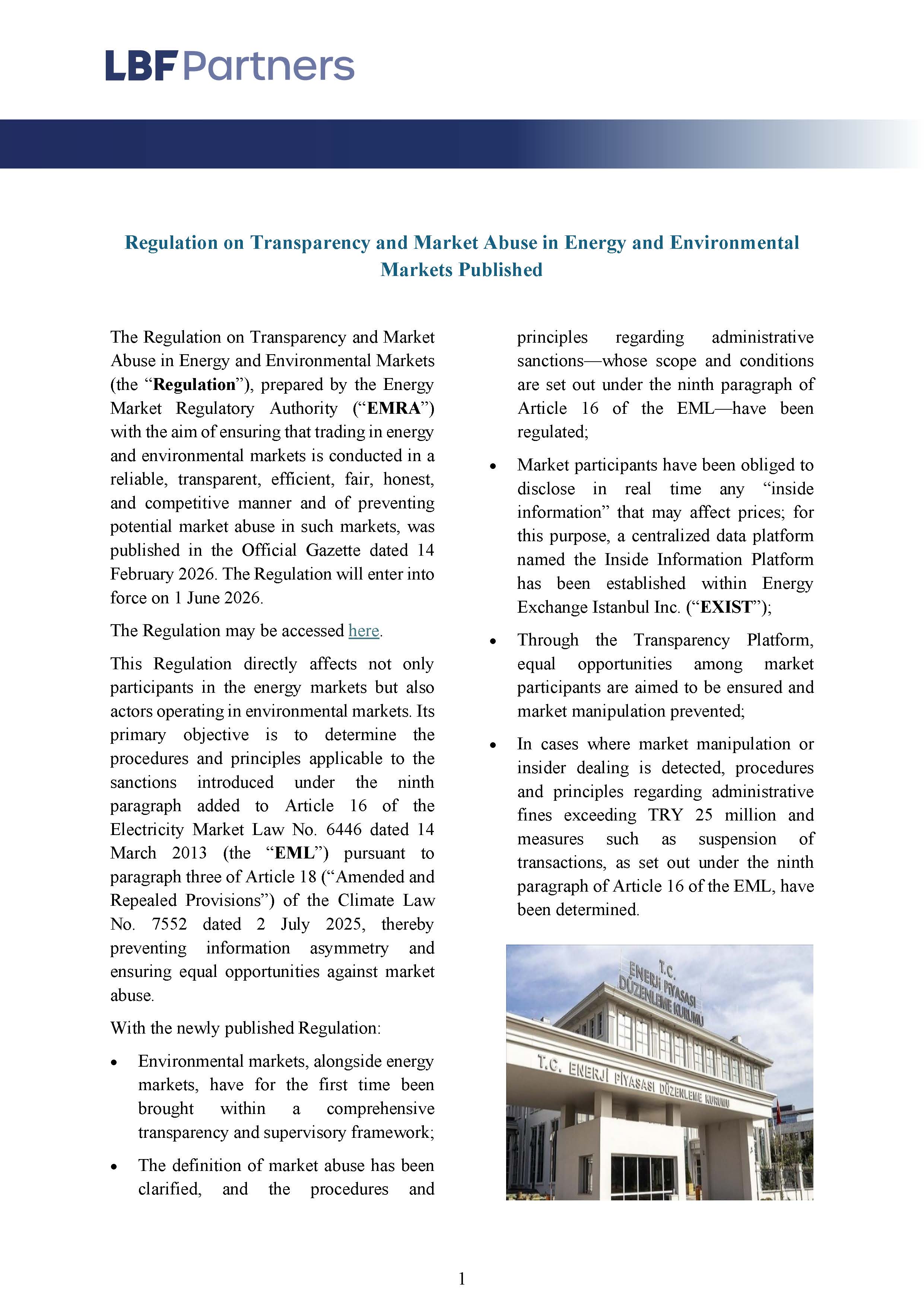 The Regulation on Transparency and Market Abuse in Energy and Environmental Markets (the “Regulation”), prepared by the Energy Market Regulatory Authority (“EMRA”) with the aim of ensuring that trading in energy and environmental markets is conducted in a reliable, transparent, efficient, fair, honest, and competitive manner and of preventing potential market abuse in such markets, was published in the Official Gazette dated 14 February 2026. The Regulation will enter into force on 1 June 2026.