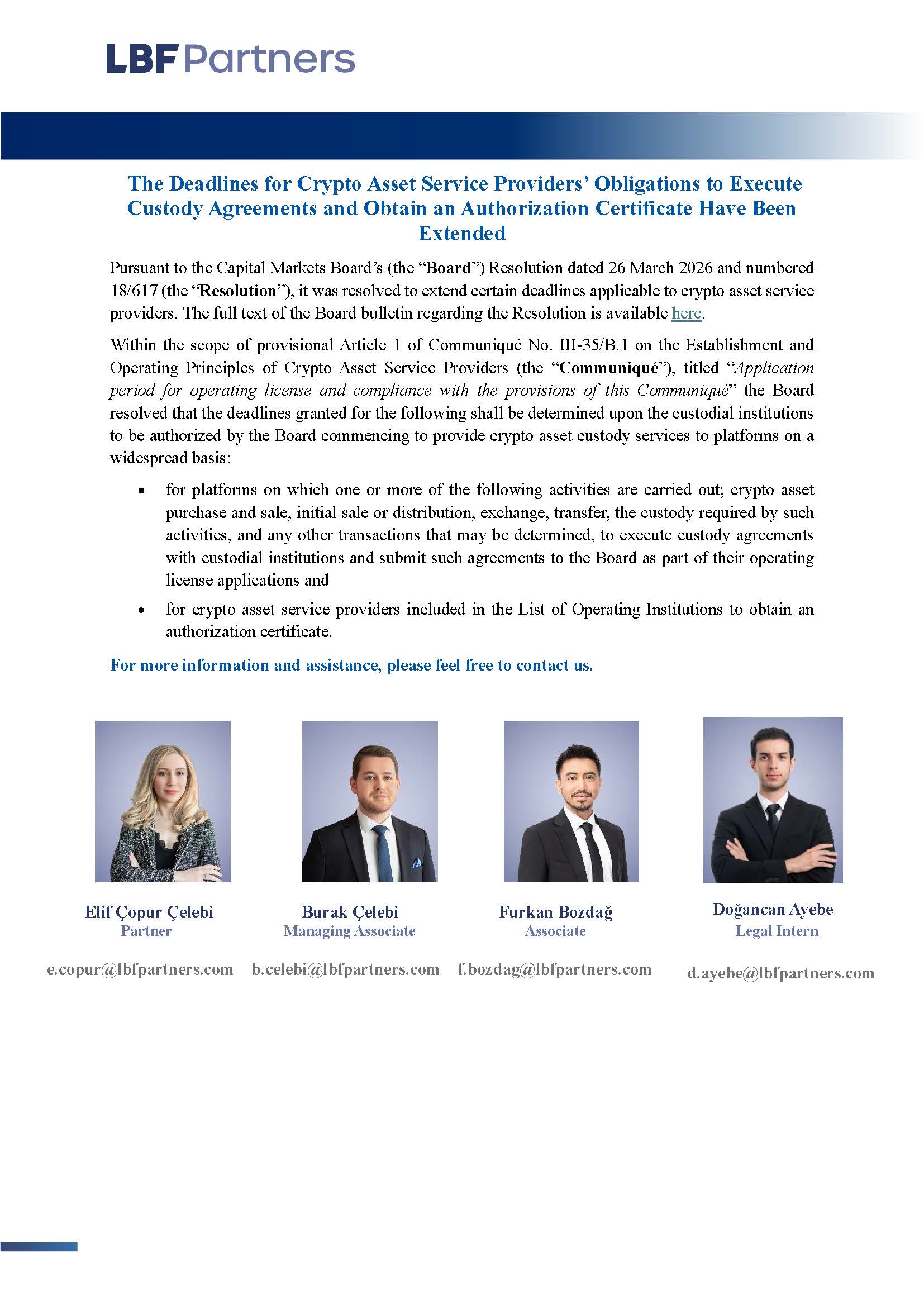 Pursuant to the Capital Markets Board’s (the “Board”) Resolution dated 26 March 2026 and numbered 18/617 (the “Resolution”), it was resolved to extend certain deadlines applicable to crypto asset service providers. The full text of the Board bulletin regarding the Resolution is available here.