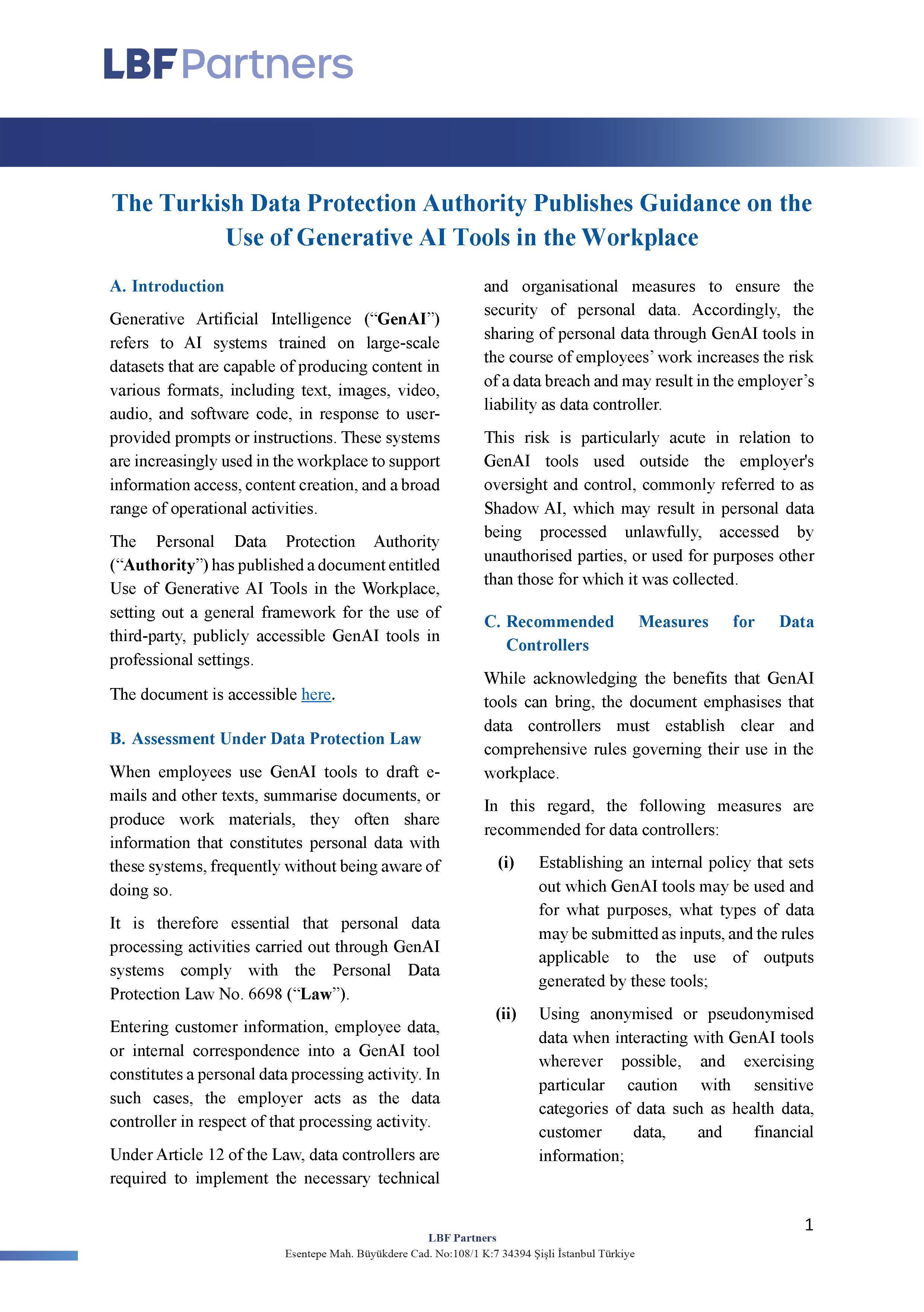 Under Article 12 of the Law, data controllers are required to implement the necessary technical and organisational measures to ensure the security of personal data. Accordingly, the sharing of personal data through GenAI tools in the course of employees’ work increases the risk of a data breach and may result in the employer’s liability as data controller.