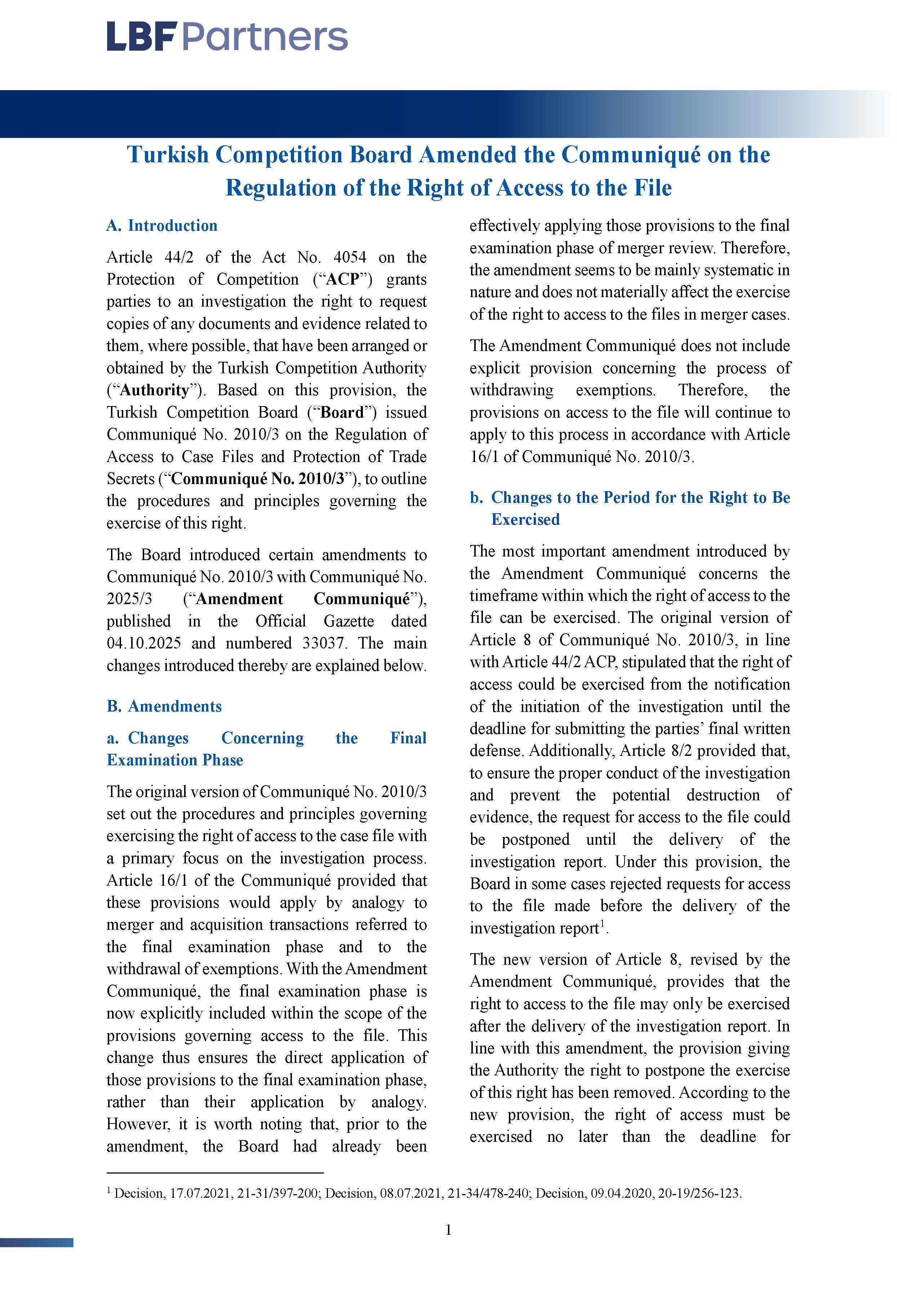 The original version of Communiqué No. 2010/3 set out the procedures and principles governing exercising the right of access to the case file with a primary focus on the investigation process. Article 16/1 of the Communiqué provided that these provisions would apply by analogy to merger and acquisition transactions referred to the final examination phase and to the withdrawal of exemptions. With the Amendment Communiqué, the final examination phase is now explicitly included within the scope of the provisions governing access to the file. This change thus ensures the direct application of those provisions to the final examination phase, rather than their application by analogy. However, it is worth noting that, prior to the amendment, the Board had already been effectively applying those provisions to the final examination phase of merger review. Therefore, the amendment seems to be mainly systematic in nature and does not materially affect the exercise of the right to access to the files in merger cases.