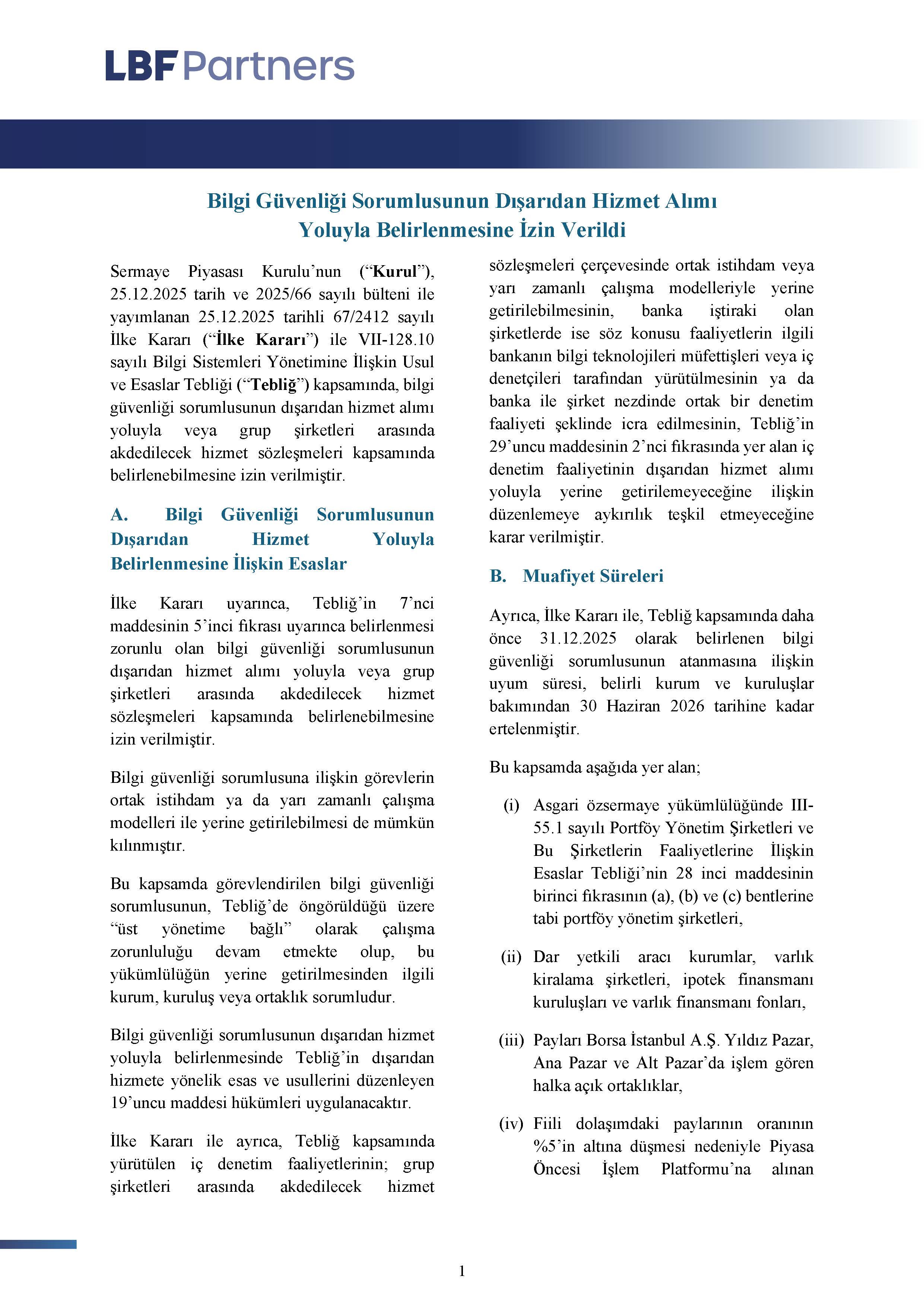Sermaye Piyasası Kurulu’nun (“Kurul”), 25.12.2025 tarih ve 2025/66 sayılı bülteni ile yayımlanan 25.12.2025 tarihli 67/2412 sayılı İlke Kararı (“İlke Kararı”) ile VII-128.10 sayılı Bilgi Sistemleri Yönetimine İlişkin Usul ve Esaslar Tebliği (“Tebliğ”) kapsamında, bilgi güvenliği sorumlusunun dışarıdan hizmet alımı yoluyla veya grup şirketleri arasında akdedilecek hizmet sözleşmeleri kapsamında belirlenebilmesine izin verilmiştir.