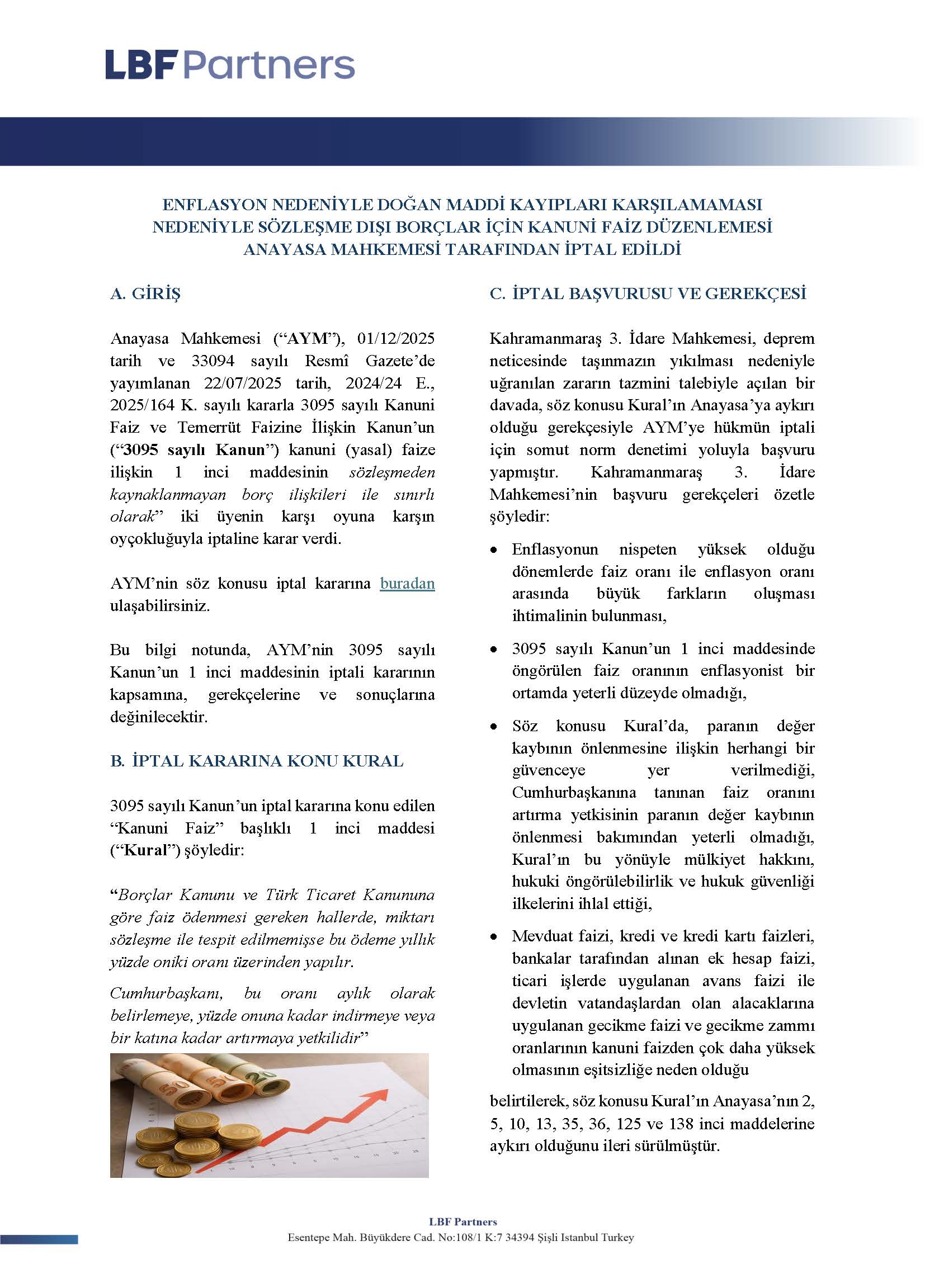 Anayasa Mahkemesi (“AYM”), 01/12/2025 tarih ve 33094 sayılı Resmî Gazete’de yayımlanan 22/07/2025 tarih, 2024/24 E., 2025/164 K. sayılı kararla 3095 sayılı Kanuni Faiz ve Temerrüt Faizine İlişkin Kanun’un (“3095 sayılı Kanun”) kanuni (yasal) faize ilişkin 1 inci maddesinin sözleşmeden kaynaklanmayan borç ilişkileri ile sınırlı olarak” iki üyenin karşı oyuna karşın oyçokluğuyla iptaline karar verdi.