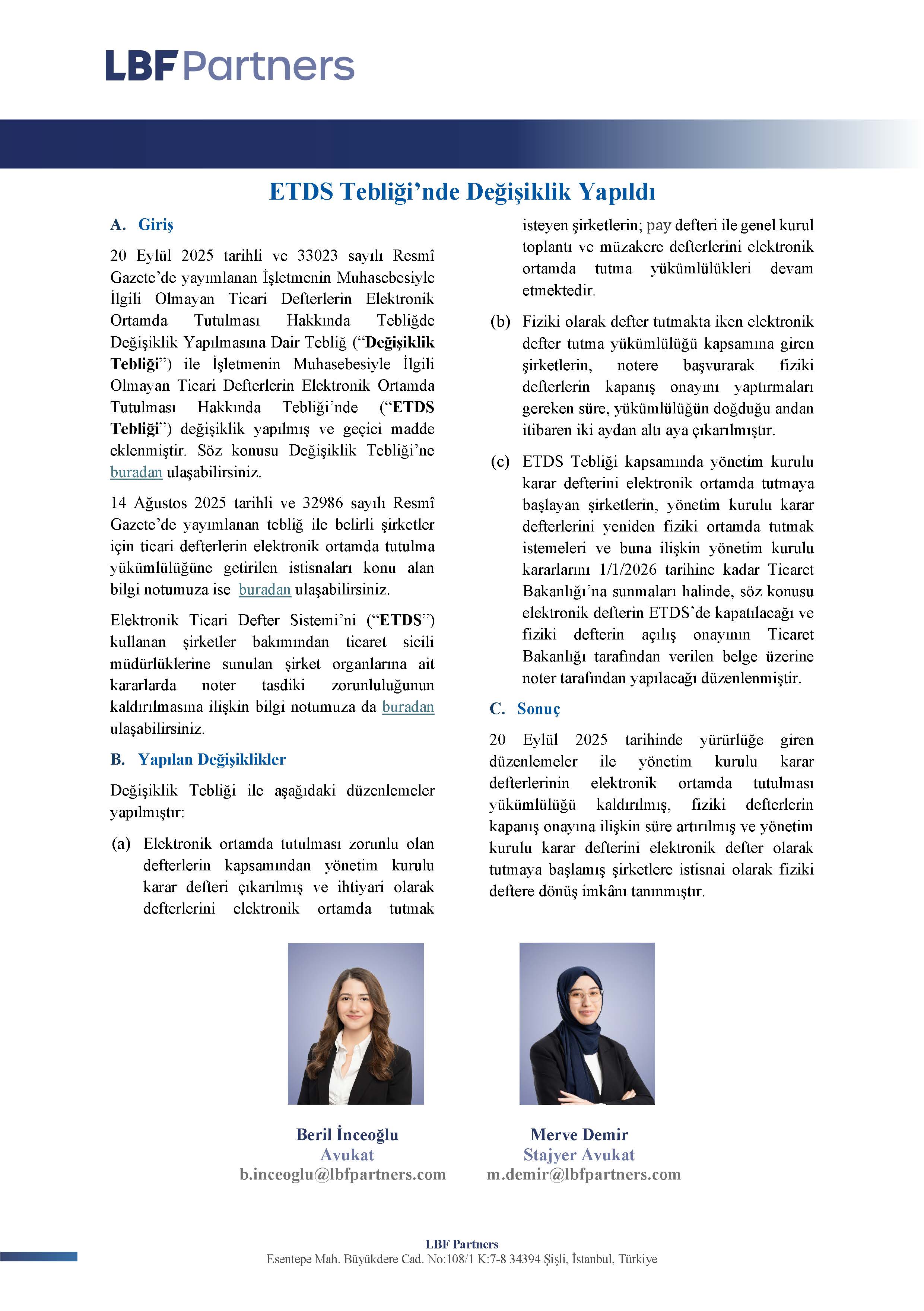 14 Ağustos 2025 tarihli ve 32986 sayılı Resmî Gazete’de yayımlanan tebliğ ile belirli şirketler için ticari defterlerin elektronik ortamda tutulma yükümlülüğüne getirilen istisnaları konu alan bilgi notumuza ise buradan ulaşabilirsiniz.