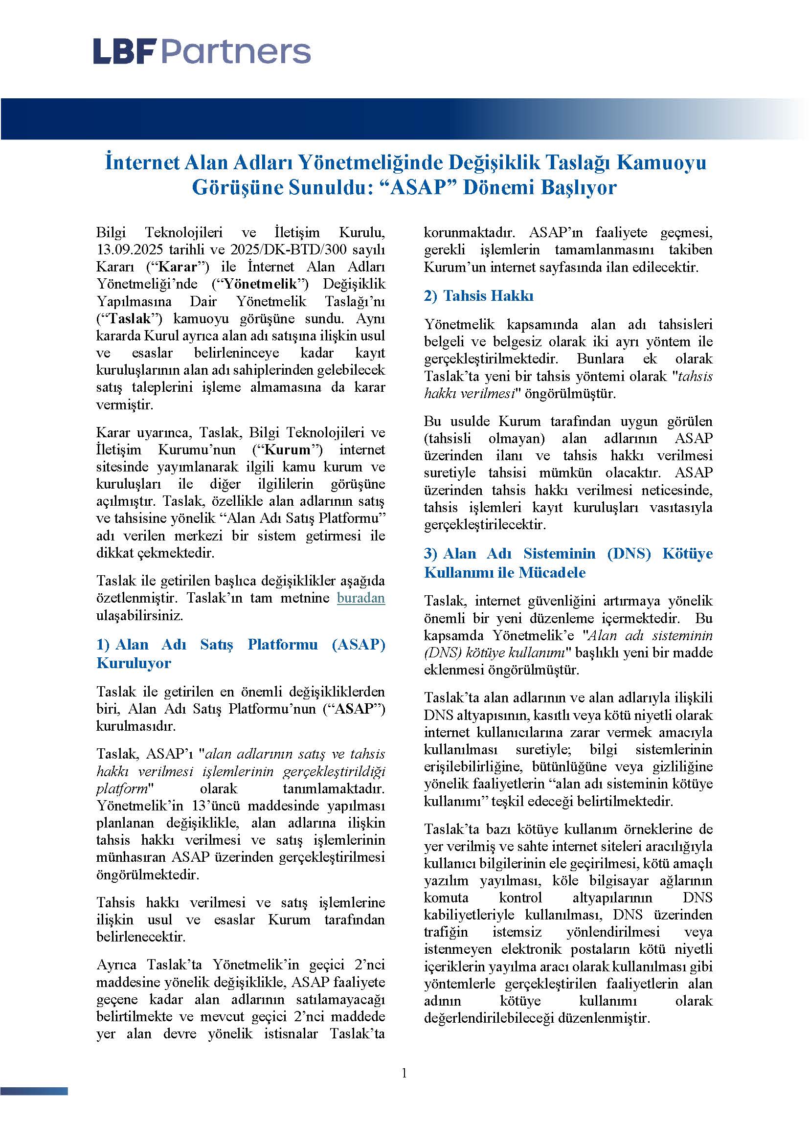 Bilgi Teknolojileri ve İletişim Kurulu, 13.09.2025 tarihli ve 2025/DK-BTD/300 sayılı Kararı (“Karar”) ile İnternet Alan Adları Yönetmeliği’nde (“Yönetmelik”) Değişiklik Yapılmasına Dair Yönetmelik Taslağı’nı (“Taslak”) kamuoyu görüşüne sundu. Aynı kararda Kurul ayrıca alan adı satışına ilişkin usul ve esaslar belirleninceye kadar kayıt kuruluşlarının alan adı sahiplerinden gelebilecek satış taleplerini işleme almamasına da karar vermiştir.