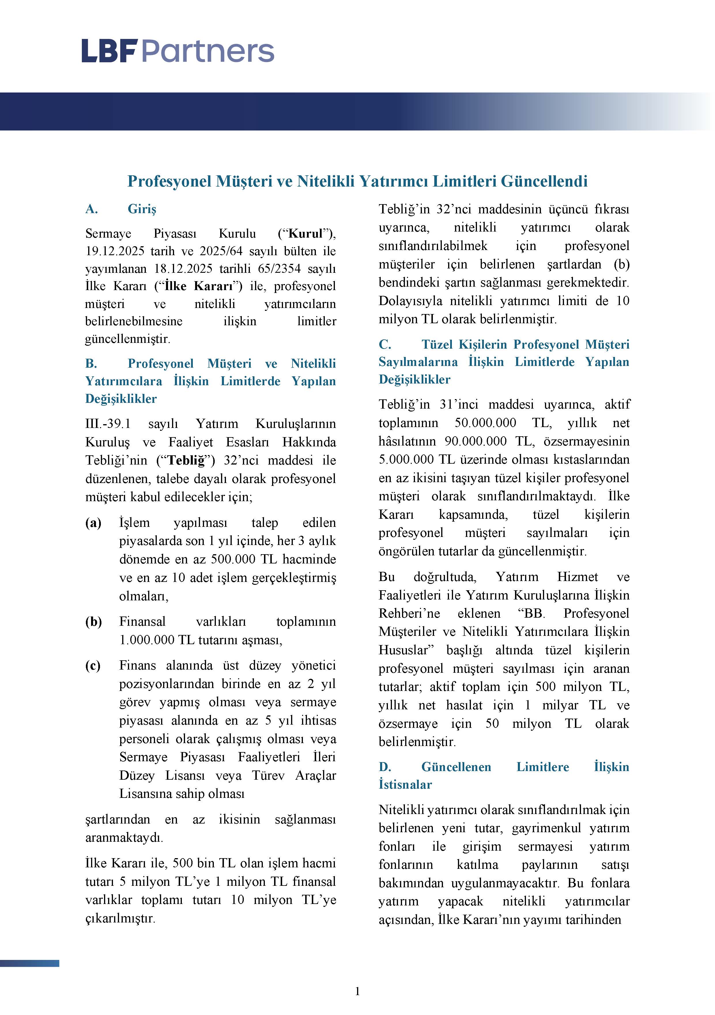 Sermaye Piyasası Kurulu (“Kurul”), 19.12.2025 tarih ve 2025/64 sayılı bülten ile yayımlanan 18.12.2025 tarihli 65/2354 sayılı İlke Kararı (“İlke Kararı”) ile, profesyonel müşteri ve nitelikli yatırımcıların belirlenebilmesine ilişkin limitler güncellenmiştir.