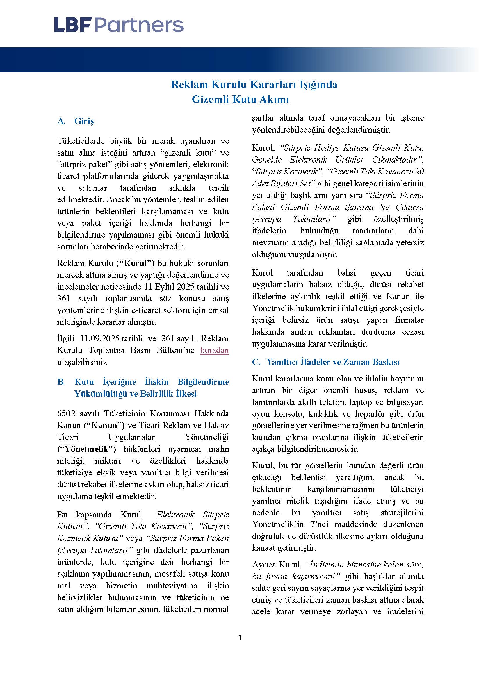 Reklam Kurulu kararları ışığında; “gizemli kutu” ve “sürpriz paket” adı altında yapılan satışların hukuka uygun kabul edilebilmesi için kutu içerisindeki ürünlerin niteliği, niceliği ve özellikle vaat edilen ürünlerin kutudan çıkma olasılıkları konusunda tüketicinin şeffaf bir şekilde bilgilendirilmesi gerekmektedir.