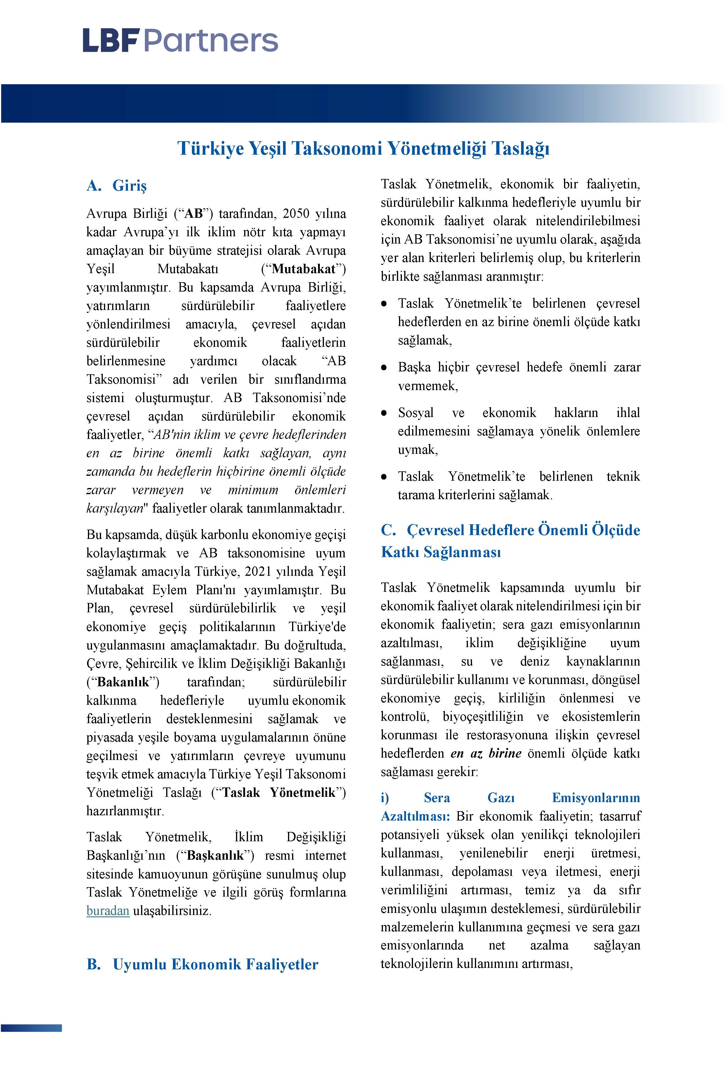 Bu kapsamda, düşük karbonlu ekonomiye geçişi kolaylaştırmak ve AB taksonomisine uyum sağlamak amacıyla Türkiye, 2021 yılında Yeşil Mutabakat Eylem Planı'nı yayımlamıştır. Bu Plan, çevresel sürdürülebilirlik ve yeşil ekonomiye geçiş politikalarının Türkiye'de uygulanmasını amaçlamaktadır. Bu doğrultuda, Çevre, Şehircilik ve İklim Değişikliği Bakanlığı (“Bakanlık”) tarafından; sürdürülebilir kalkınma hedefleriyle uyumlu ekonomik faaliyetlerin desteklenmesini sağlamak ve piyasada yeşile boyama uygulamalarının önüne geçilmesi ve yatırımların çevreye uyumunu teşvik etmek amacıyla Türkiye Yeşil Taksonomi Yönetmeliği Taslağı (“Taslak Yönetmelik”) hazırlanmıştır.