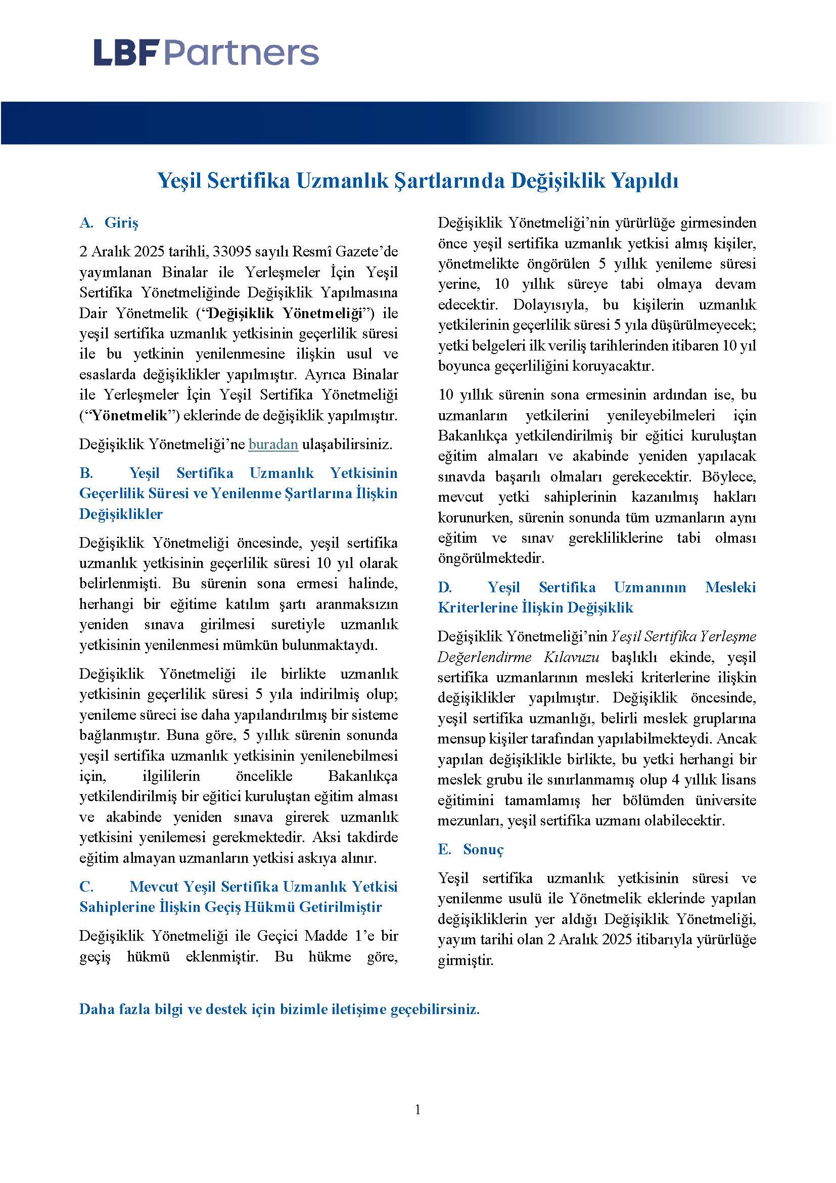 2 Aralık 2025 tarihli, 33095 sayılı Resmî Gazete’de yayımlanan Binalar ile Yerleşmeler İçin Yeşil Sertifika Yönetmeliğinde Değişiklik Yapılmasına Dair Yönetmelik (“Değişiklik Yönetmeliği”) ile yeşil sertifika uzmanlık yetkisinin geçerlilik süresi ile bu yetkinin yenilenmesine ilişkin usul ve esaslarda değişiklikler yapılmıştır. Ayrıca Binalar ile Yerleşmeler İçin Yeşil Sertifika Yönetmeliği (“Yönetmelik”) eklerinde de değişiklik yapılmıştır.